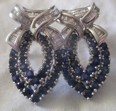 Stunning 18k white gold large drop earrings with blue sapphire and diamonds. There are 26 round cut sapphire and about 1 ctw baguette - cut diamond in each earringss. Diamond colur J-K- clarity SI 1 -Sl 2. 18k gold hallmark. Total weigh 21,2 grams. One of a kind earrings. Takst-Valuation N. Kr. 50 000