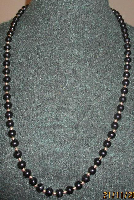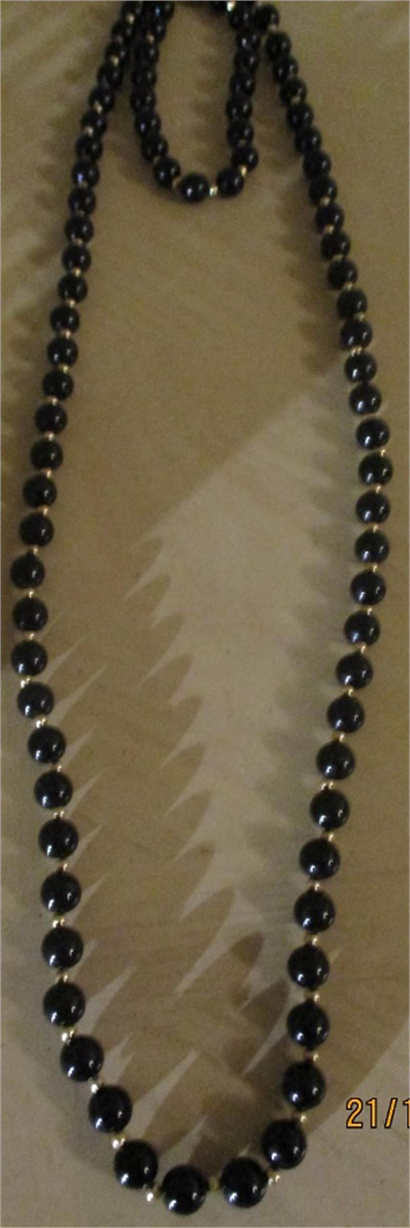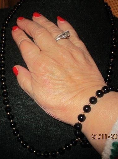 The necklace is 76 cm long. It has 70 onyx balls and 70 small 14k gold beads.The necklace takst-Valuation N.Kr. 8000 The bracelet is 20,5 cm long. It has 14k gold locks and has 18 onyx balls and 18 14k gold beads. The necklace takt-Valuation N.kr. 4000. It is in very good condition.