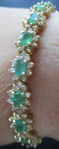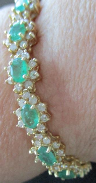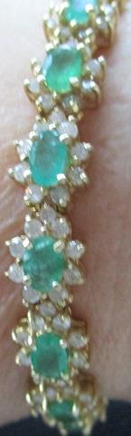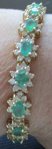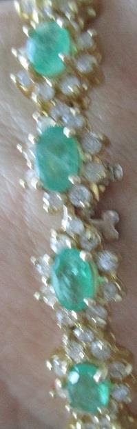 14k gold bracelet, consisting of 18 links with oval emeralds 6x4mm and 9 brilliant cut diamond around. 18 emeralds calculated weight 7,50ct and 162 diamond calculated weight 4,86ct. Total weight 21,7 grams. The stones in this beautiful bracelet are not first class. This is reflected in th Valuation. Takst-Valuation N.kr. 80 000