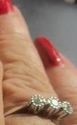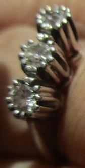 14 k 585 marked white gold 3- stone diamond ring. Three brilliant ut diamond total weigh 0,23ct. Takst-Valuation N. kr .12 000