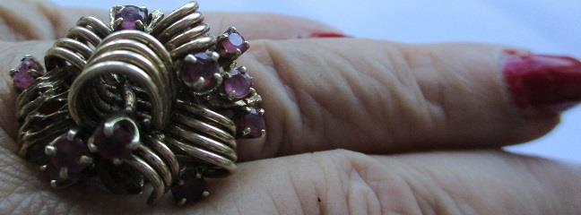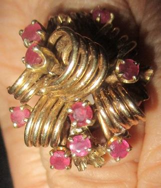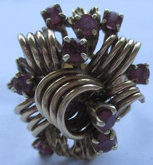 A yellow gold cocktail ring stamped 14k, with 10 rubies 2,5-3mm. Total weight 11 grams. Takst-valuation N. Kr.11 000