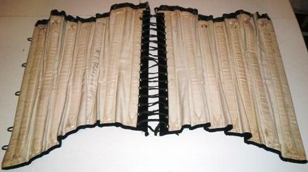 xxThis is a great W.E. Watch Spring No.2 Corset. It is made of black silk with shiny blue flossing. Matching blue and black scalloped trim decorat the top of the corset. Boned with watch spring. It is made in England around 1895-98. It is in very good condition.