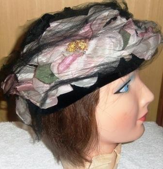 Hat with netting and flowers.