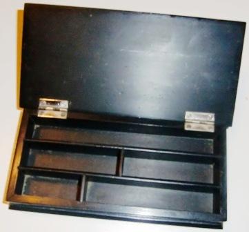 Oh this is a wonderful set. Two brushes, one box, one tray and a pair of glove stretchers. All In the fiest black ebony. In wonderful condition consummate for their age 1880s .