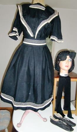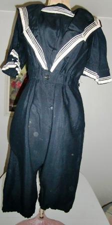Woman typically dressed in black, knee-lenght, puffed-sleeve wool dresses, often featuring a sailor sollar, and worm over bloomers or drawers trimmed with ribbons and bows. The bathing suit was typically accessorized with long black stockings, bathing slippers, and fancy cap.