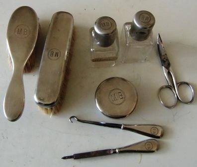 The pieces have the monogram "M.B.". The lids on the 2 glass bottles,