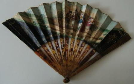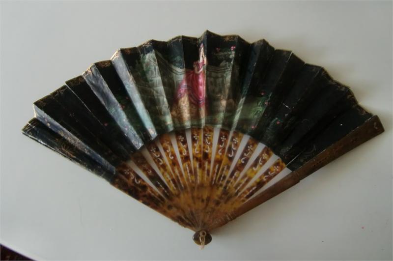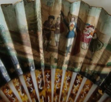 Fan sticks are 10.5 inches long and made from horn. Upper part of sticks are decorated with pierced work, designs and floral. Fan measures 25 inches open. When open the sticks are pierced and on every other one there is small gilt set of three leaves. The leaf of the fan depicts a stage play. Five figures in center stand on wooden flooring, table and chairs and buildings in background. Man in center holding hat and cape. They are dressed in pseudo Shakespearean clothing. On flip side a woman leans up against a staircase dressed in a lovely hand painted pink gown, style of the late 1860’s, small dog at her feet, rose bushes on each side, urns on edges of staircase. Condition in good though there are a few places in the creases of the fan that have split. The largest is 3” with another 2” one. TB