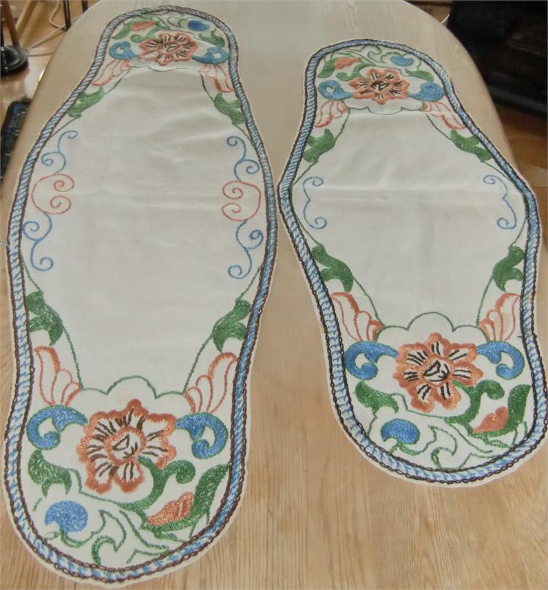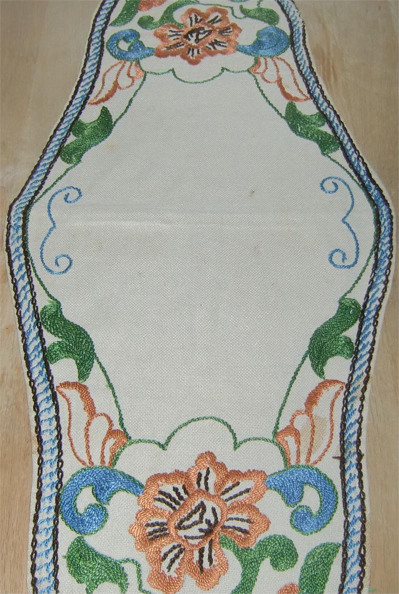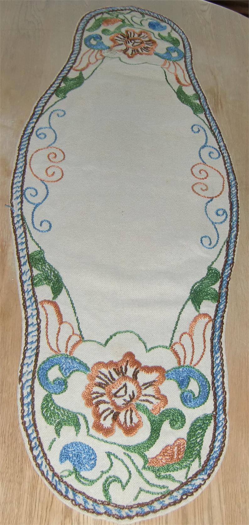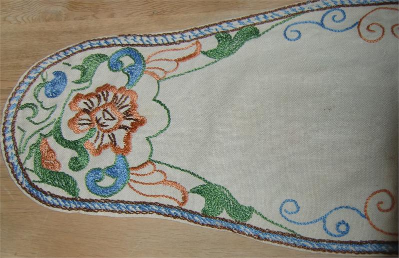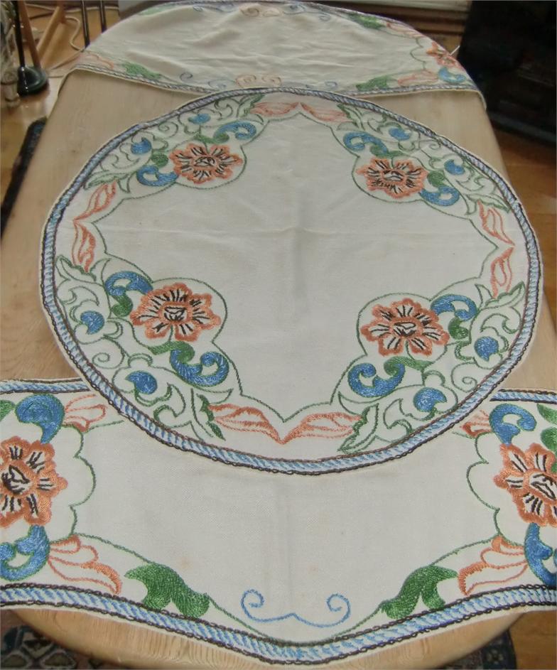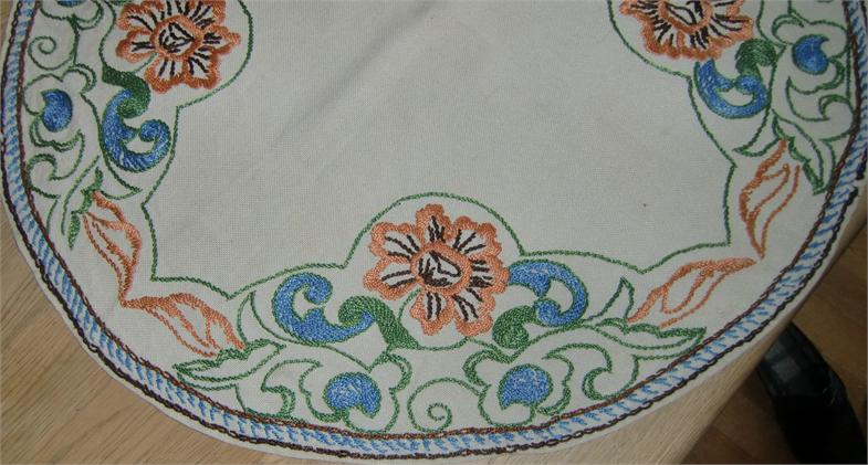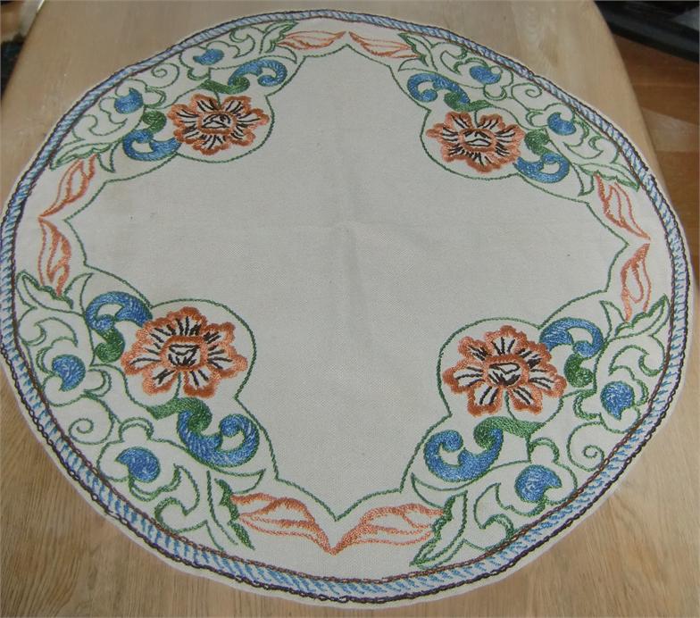 Three cloths embroidered in the same pattern on linen. The round tablecloth measures 0.70 meters in diameter.The longest oval tablecloth measures 1.00 meters long and 0.70 meters at its widest. The smallest oval tablecloth measures 0.80 meters long and 0.38 meters at its widest. They are in good condition and is still in use