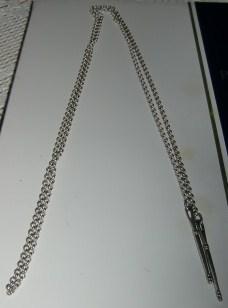 Cufflinks 925S and long chain in pewter. Cufflinks are used to the shirt on the costume. The link in the pewter is used to lace together bunad. Vintage clothing museum 1940-1970-designers showing at number M379M Sunnfjord bunad. Where seen the long chain in pewter in use. Both cuff links and pewter link is in excellent condition