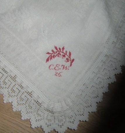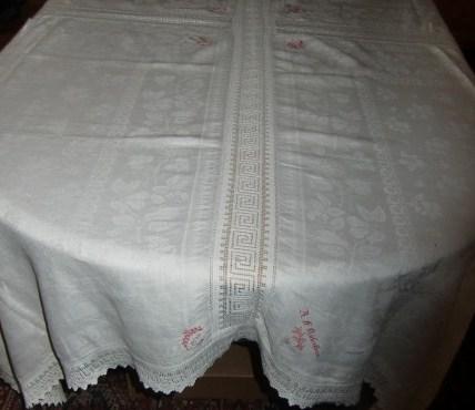 M656M Large 1920s Damask and Lace tablecloth.