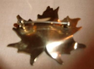 This beautiful vintage brooch is a classic maple leaf design by Hroar Prydz of Norway. Made of sterling silver with a gold vermeil wash, it is finished with vitreous glass (kiln-fired) enamel in warm, autumn shades of pale yellow, amber, and brown. The translucent enamel is applied over a detailed basse-taille pattern of veining, giving the piece a very realistic appearance. The piece also has the curvature of a fallen, drying autumn leaf.