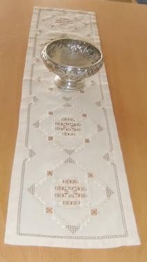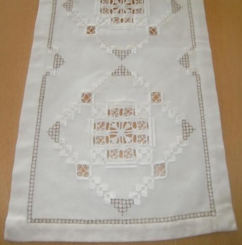 Atypical Hardanger western stitching. This is not a hardanger tablecloth, but the embroidery is very similar. I only know the name of western stitching. It is here directly translated. I am no specialist in embroidery. When I know more about the stitching I come back. The canvas is in excellent condition. It measures 0.96 meters long and is o, 24 meters wide.