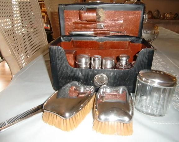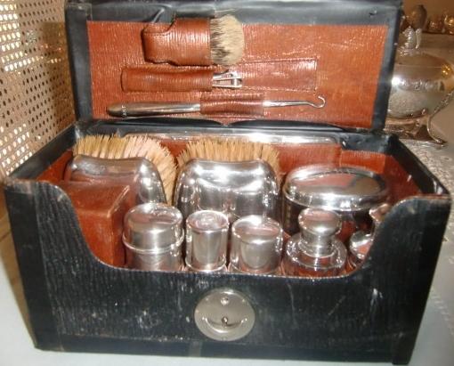 M809M Titanic area 1912 Silver 925 Gentleman vanity case. gentleman vanity box from Tatanic period 1912. The box is in leather and carrying small signs of wear, as may be seen photographers. All content is stamped 925 sterling silver and made of Gorham USA. The box contains 1 Baber cost with beaver hair. 2 Button hook. 3 neil cut and file. 4 silver case for the comb. 5 Two large brushes. 6 Leather case for Baber planer. 7 Soap case. 8 Soap case. 9 Case for pudder.10. Two bottles of aftershave. 11 A large cream carton. All in very good condition.