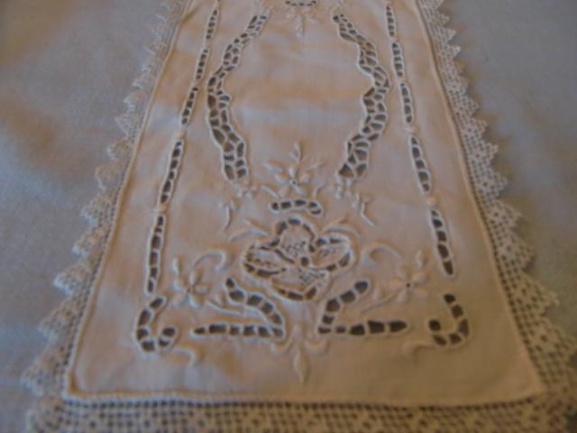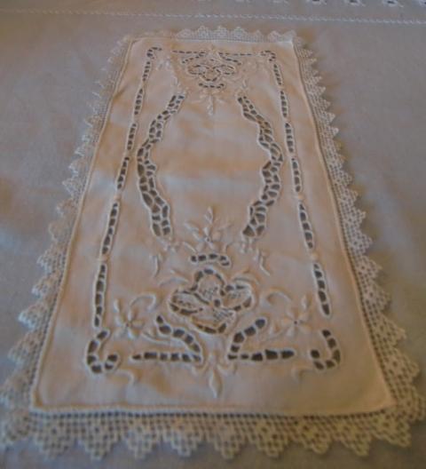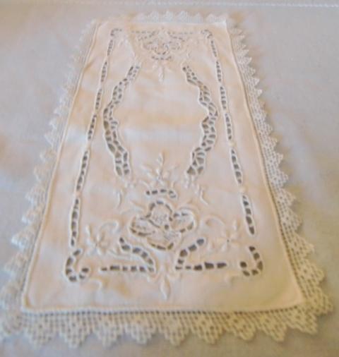 M834M Great hand embroidered doilies. Great hand embroidered doilies. Seven Pieces that have been used to lay the cover plates. They are in white linen with beautiful white broderie. They measure 28.00 cm long and 15.00 cm wide. They are in outstanding condition.