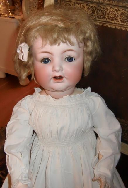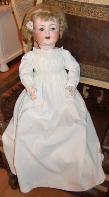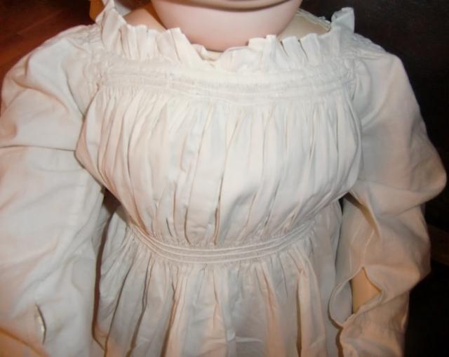 xxM871AM Early Victorian girl gown. A CHILD'S EARLY VICTORIAN GOWN SQUARE NECKLINE, WITH 1 INCH SOFT, PLEATED UPRIGHT FRILL THE YOLK IS,GATHERED INTO PLEATS AND RUCHED AT EDGE'S FRILLED OVAL SHAPE TIES DRAW-TIE AT THE BACK VERY DURABLE, STARCHED COTTON LENGTH 33 INCHES CHEST 22INCHES SLEEVE'S 12 INCHES INC.LACE [ORIGINAL BUTTON ON BOTH SLEEVE'S]