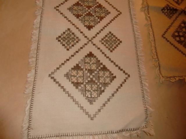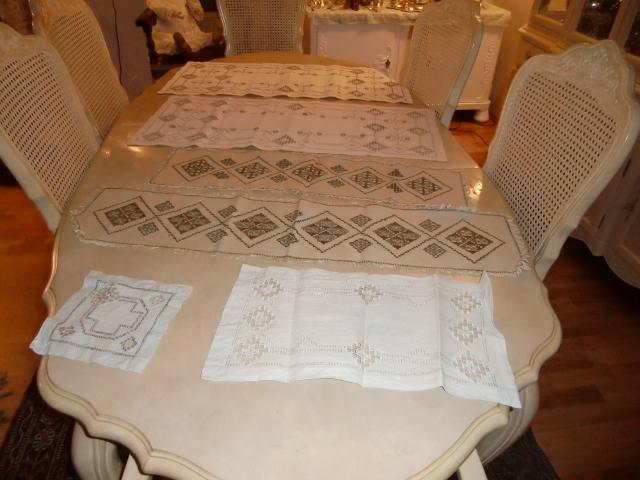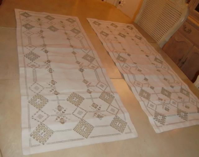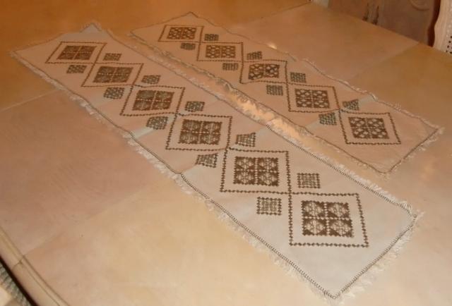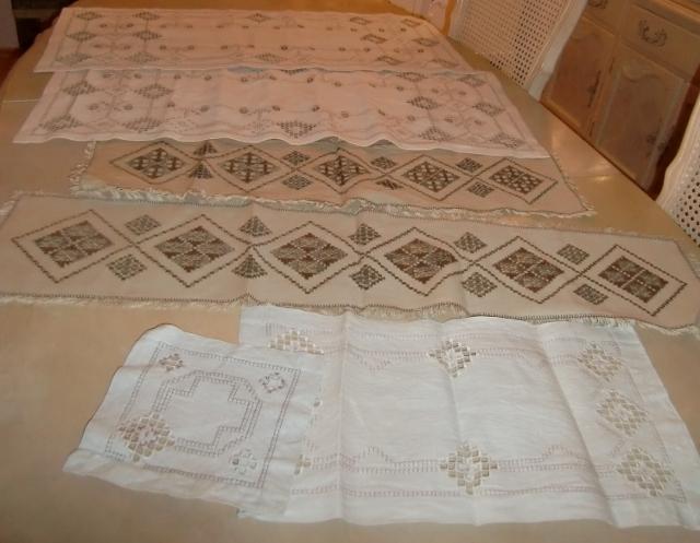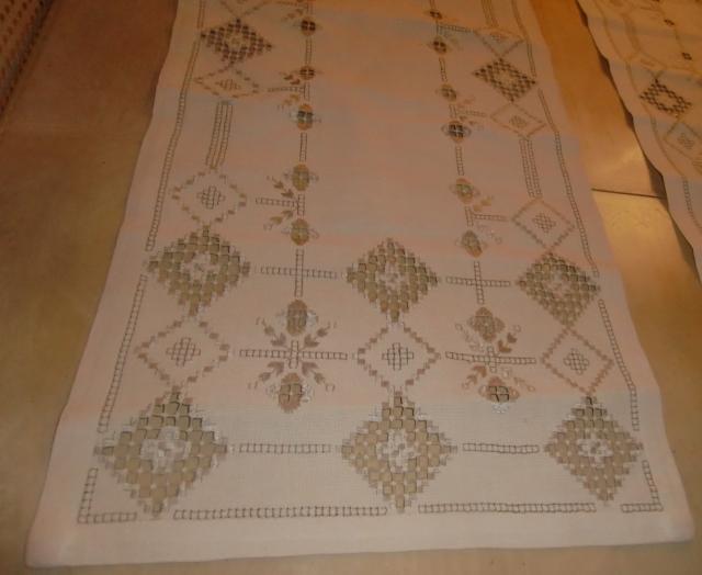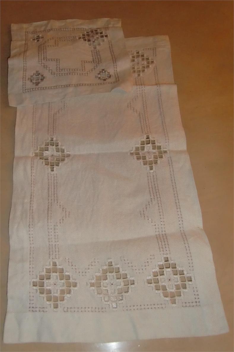M880M Hardanger stitching six runnersA collection of Hardanger stitching. It consists of five runners and one piece. 1 a pair consisting of a runner and a piece in light beige linen with white and silver embroidery. The runner measures 50 cm long and 27 cm wide. The piece is square and measures 20x20cm. 2 A pair of beige linen runners with silver and brown embroidery. The Storset measures 98 cm long and 22cm wide. the smallest measures 80 cm long and 22cm wide. 3 Two equal light beige linen runners with white and silver embroidery. They measure 92 cm long and 40 cm wide. All of it in excellent condition..