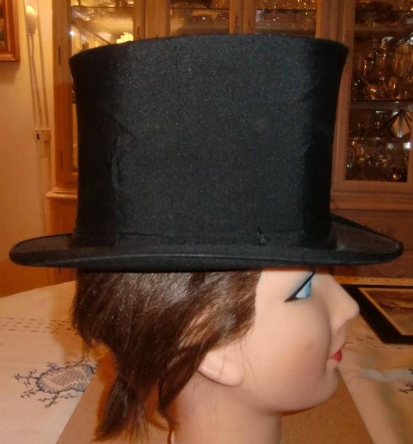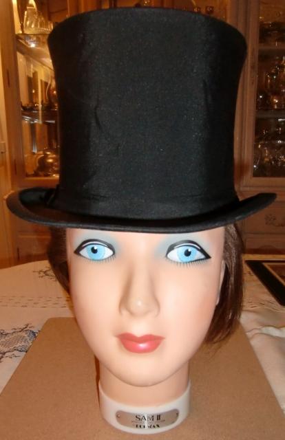 M907M Delion, Paris Colapsible Top-Hat. Chapeau claque was invented in 1812. The name comes from French and means roughly "hat slams" This kind of top-hat can be folded and taken up again by action of a spring mechanism. This chapeau claque is made by A. Delion, 24 Boulevard des Capucines, Paris. This company became famous for their hats and is represented in museums throughout the world. This chapeau claque is made of silk satin and is fully lined. It was made around 1900 and is in very good condition.