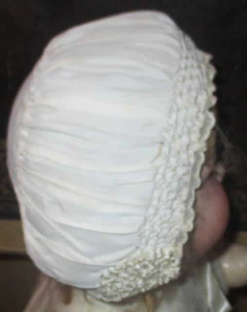 M951M Antique,Ivory Silk Baby Cap. Pretty antique baby bonnet. It is silk with lace trim. I do not know aging, but guessing it is late Victorian ca 1890. All bonnet comes from the same family and extends from the 1830s to the 1930s. This bonnet is in very good condition.