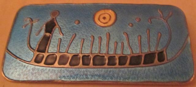 M968M Fantastic brooch Silver and enamel David Andersen designer Nora Gulbrandsen. A beautiful David-Andersen Norwegian sterling silver and enamel rectangular "rock carving" brooch. The back is marked, D-ANORWAY STERLING 925S NORA G." and "ROCK CARVVINGS FROM NORWAY 1000-1500 BC". Designer is Nora Gulbrandsen. The brooch measures 2 1/2 x1 1/4 inches (6.5 x 3.1 cm). Weight is 22.6 grams. Excellent condition. Nora Gulbrandsen (29 November 1894-14. February 1978) [1] was a Norwegian designer and craftsman.