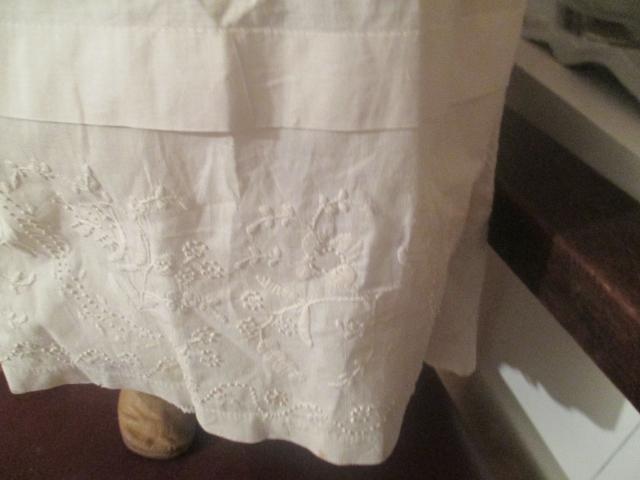 . The dress has an embroidered hemline. The embroidery is designed with satin stitching and French Knot stitching. The dress has a drawstring neckline. Shoulders 8 Bust 22 Length 23. In very good condition