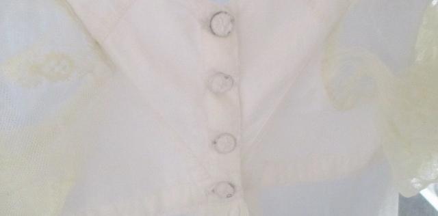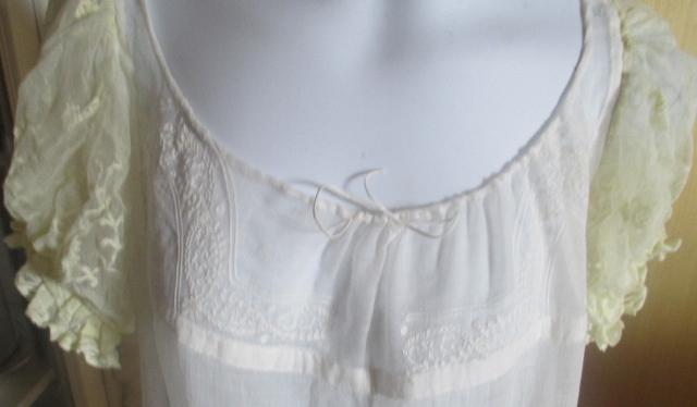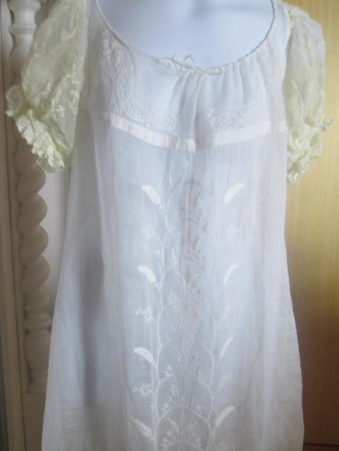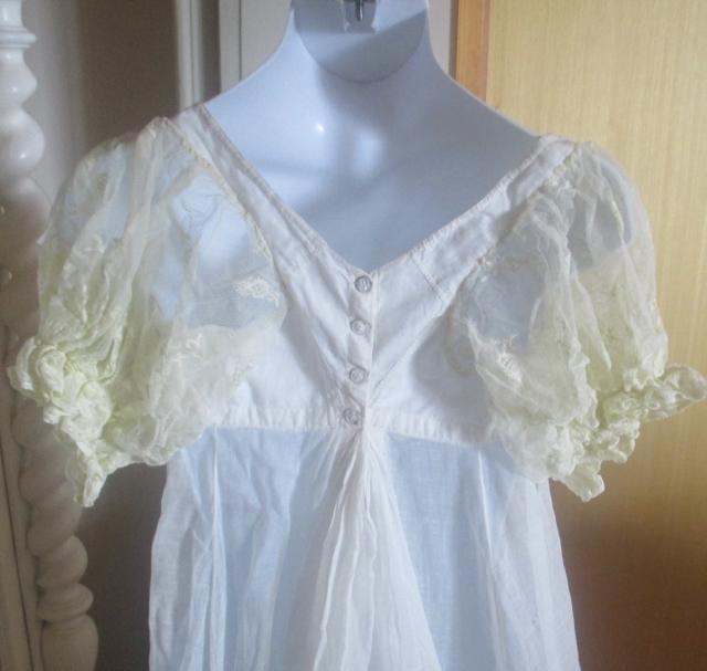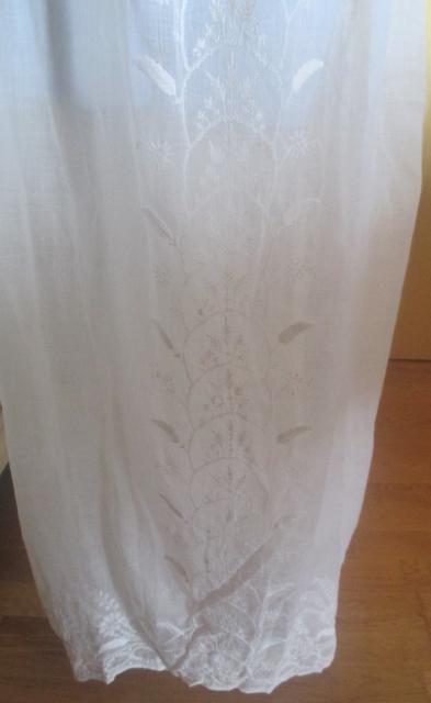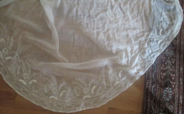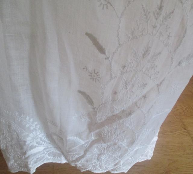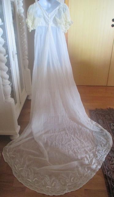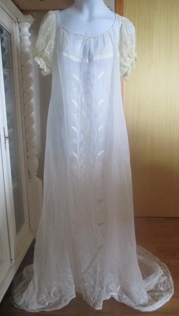 With Train. The dress is thin muslin with lovely white stitching embroidery. Early in 1800, cotton is the news that was only reserved for the upper class. Musilin referred to a varity og white cloth woven from very finr spon Cotton yarns. The resulting cloth was transparent and gause-like.The gown is in very good condition.