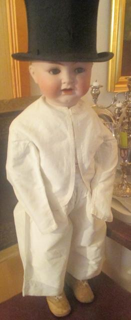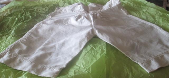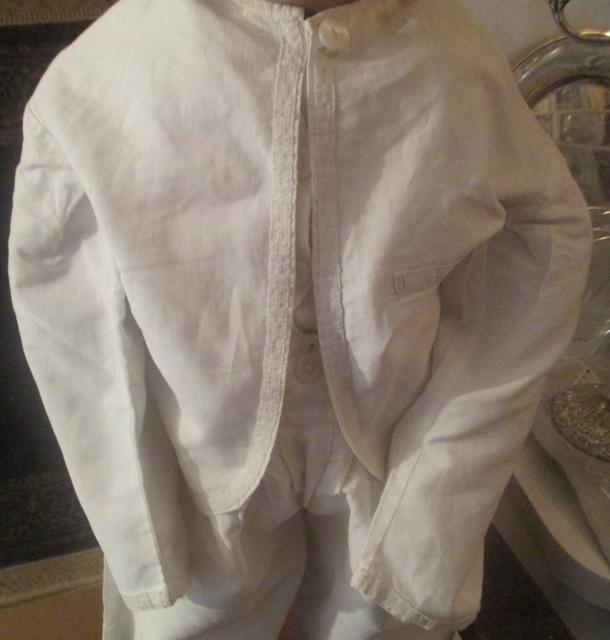 xxM992M Civil War Era Boys 1860s Cotton Suit. A precious boy’s 1860’s white cotton two piece suit. The jacket and pants legs are trimmed with white cotton. The jacket is unlined and has a one button closure at the neckline. The pants are unli...ned. The suit is in crisp and clean condition. There are no holes. The suit has been de-accessioned from a museum collection and they wrote the numbers on the edge of the jacket. Shoulders 13 Chest 24 Waist on pants 22 Pants length 15.