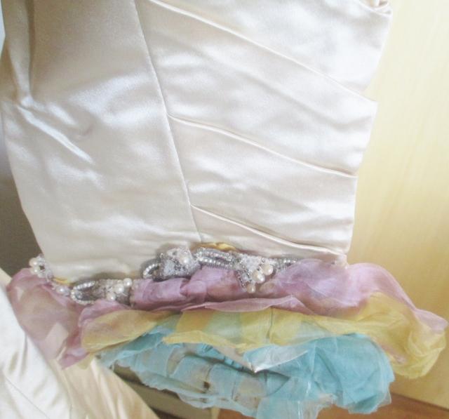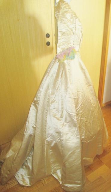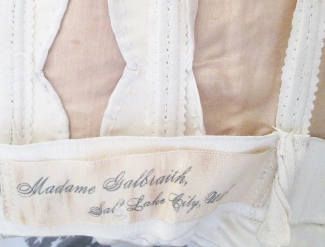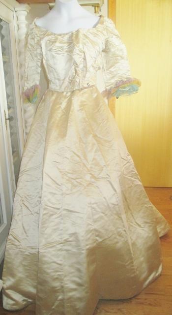 xxM1010M Late Victorian wedding gown Nice Here is a wonderful example of a late Victorian gown made of a luxurious peau de soie thick silk. The bodice is lined in linen and heavily boned. The sleeves are decorated with gaily colored chiffon. The huge skirt is magnificent; such a full sweep. In very good condition for its age with little damage to the silk; there are a few marks here and there (please see detail photos). The skirt is lined in a tissue silk that is disintegrating. Such a beautiful ensemble, it was likely a wedding gown. The label reads: "Madame Galbraith, Salt Lake City, Utah." Measurements: Bodice: Bust: 32 Waist: 20" Length (top of shoulder to waist): 13" Sleeve length (under arm to cuff): 10" Skirt waist: 22" Skirt length in the front: 39" Skirt length in the back: 48" PRice 1200USD
