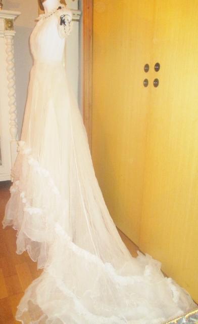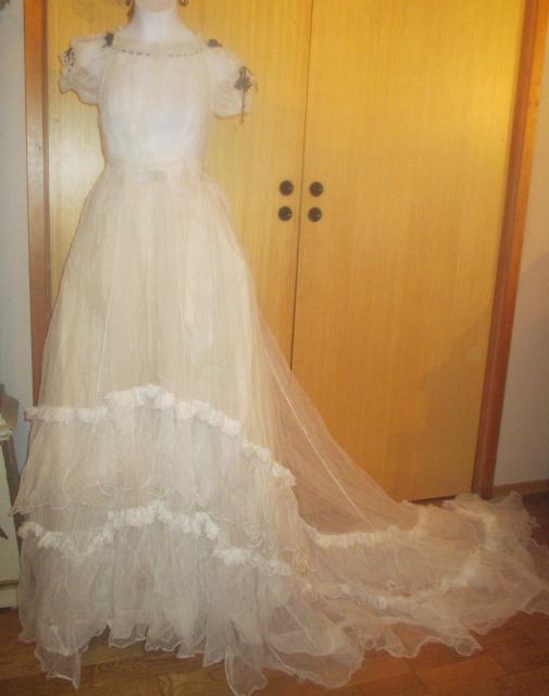 xxM1015M 1850-60 ball or wedding gown. This hand made gorgeous dress is made at 1850 to 1860's. It is thin cotton tulle and does not weigh much. At the time, light dresses were popular. About this dress has been made as wedding dress is unclear. Wedding dresses at that time had many colors. It might as well have been a ball gown. The dress is in very good condition.