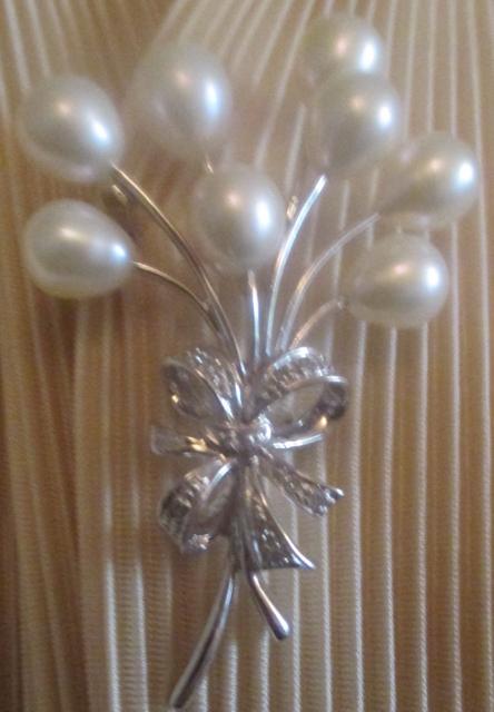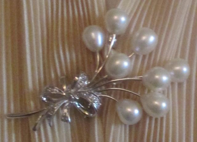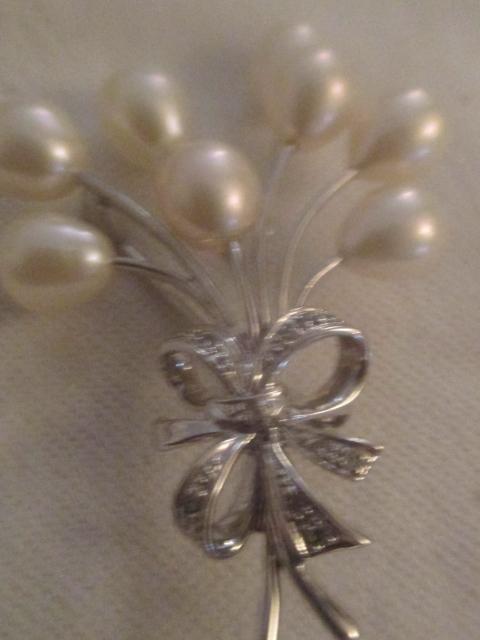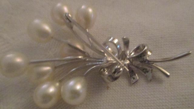 xxM553M 14kt White gold pearls and diamond brooch. Authentic 14 kt white gold 9 8/8 diamonds and 8 genuine cultured pearls. The brooch measures 52 mm long x 34 mm wide and it is marked 585 14kt. In excellent condition and weighs 8.1 grams. Takst-Valuation N.Kr 12000.