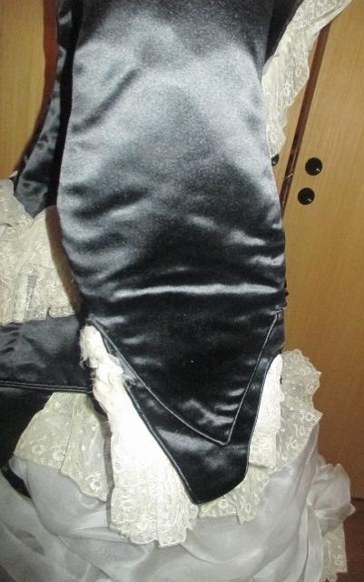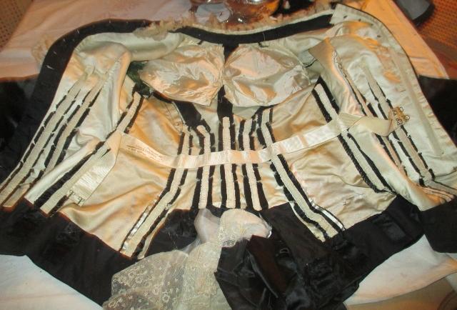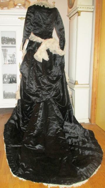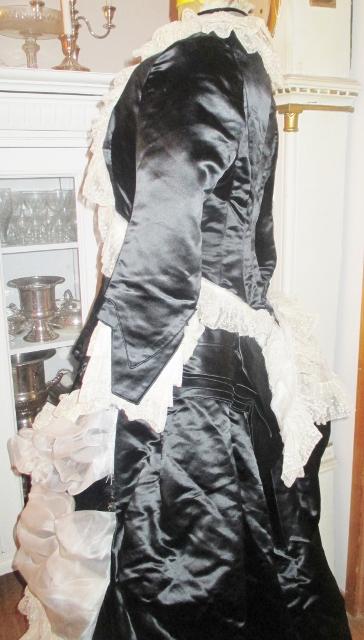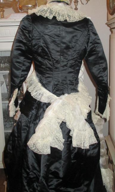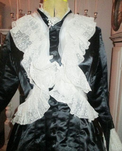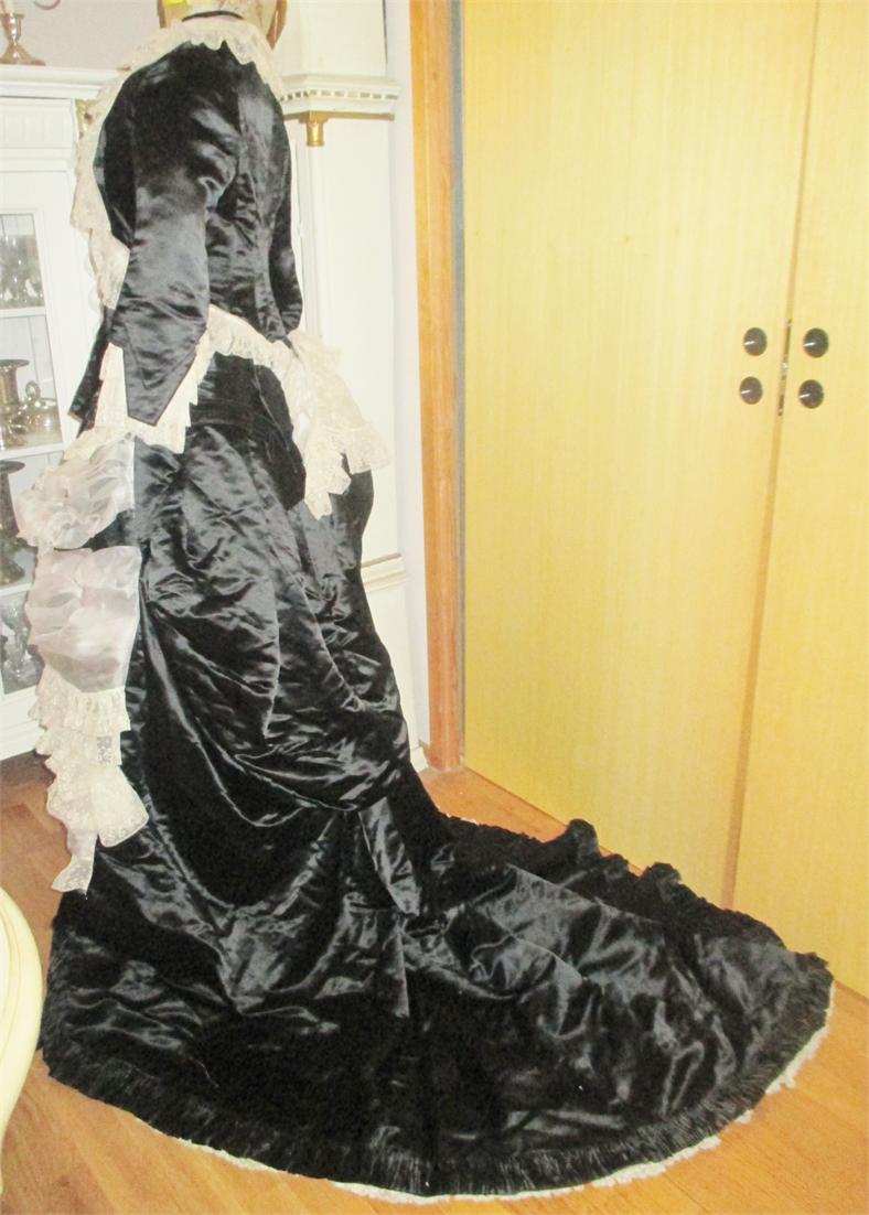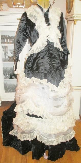 xx M1076M 1880s Paris label gown. This is an original 1880 Paris label gown. It is in thick black silk satin and white silk chiffon and lace. The jacket has whalebone slats that are not broken. The recently renovated and is in excellent condition. Look at the pictures. The dress has many great detail that does not appear in photographs. I'll take more pictures. On the inside of the jacket read label: Simons Robes & confections 9 Rue Soribe, Paris.