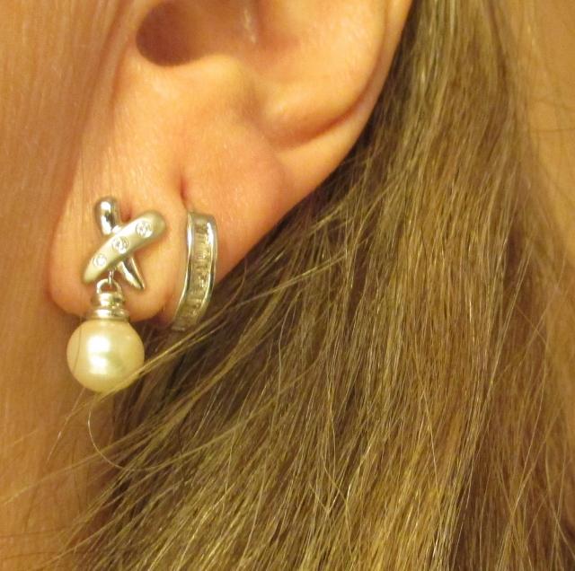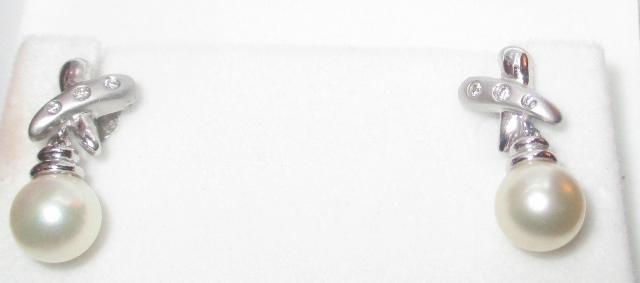 xxM1083M 14K WHITE GOLD WHITE PEARL (7.5 MM) and 6 DIAMOND DANGLE PIERCED EARRINGS J1-E weighing 3,7 gram.There isn't anything more elegant than a nice pair of PEARL/DIAMOND earrings. They can be dressed up or down. The earrings are 14K white gold with a shiny and satin finish in an ''X'' design and highlighted by 6 round brilliant diamonds. 3 on each earring. The pearl has a fabulous white luminescent and measures 7.5 mm. They have a secure post back with butterfly fastener and are stamped 14K.. What a wonderful pair of PEARL/DIAMOND earrings.