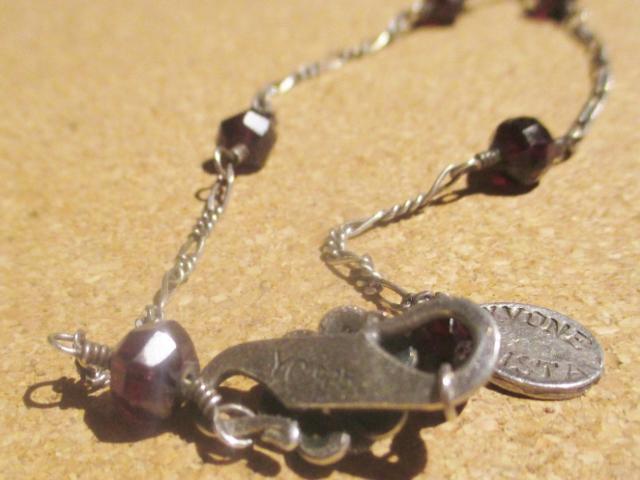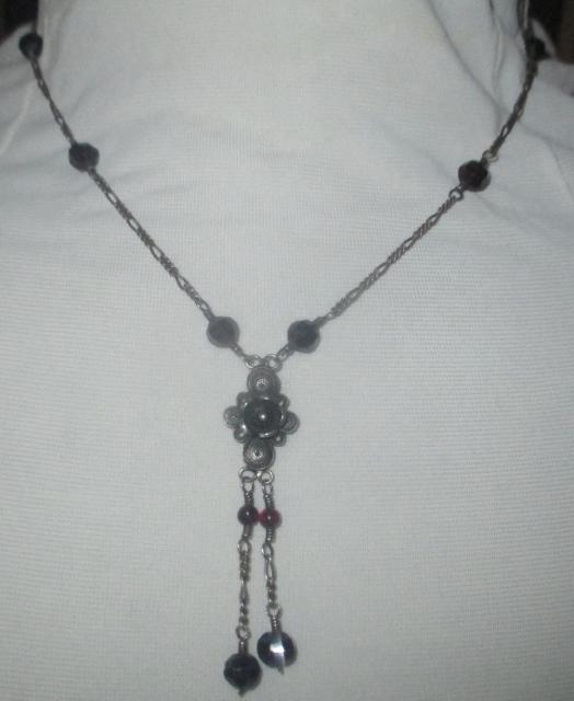 xxM1108M Yvone Christa 925s design necklace, The chain is 45 cm long. Filigree work with red stones. In excellent condition. Yvone Christa New York is famous around the world for reinventing the ancient technique of traditional filigree jewelry to create new lines of jewelry in a modern key. Every single piece of jewelry is hand crafted with the ancient Venetian filigree technique: thin silver wires are delicately twisted into patterns and solded together, and then given an aged finish. Many pieces includes fresh water pearls and semiprecious stones like jade, quartz, jasper, citrine, amethyst, onyx and cubic zirconia. This look of oxidized 925 silver or gold plated in 18 karat gold is what makes Yvone Christa’s jewelry iconic.