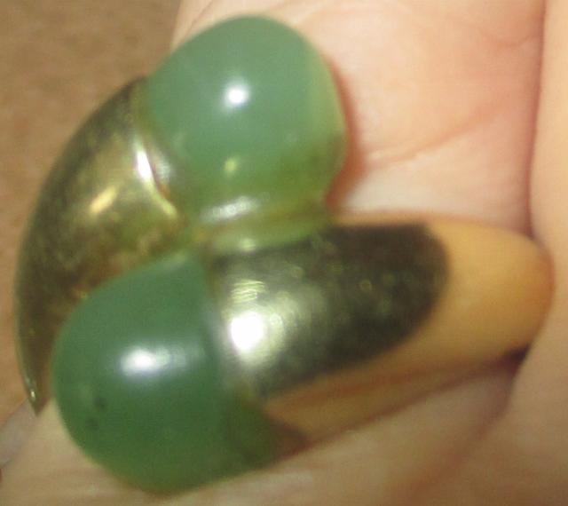 xxM1111M 14k gold and grossular stone ring. Beautiful, large and heavy 6,2 grams 585-14k gold and green grossular stone ring. It has a jeweler's stamp. It is a little unclear, but I think it is one of the renowned Norwegian goldsmiths. Grossular minral in the garnet group, which is formed by contact metamorphosis or unlean limestone, eg in Oslo fields. It can be colorless yellow, gren, brown, red etc. Takst Valuation N Kr 6500