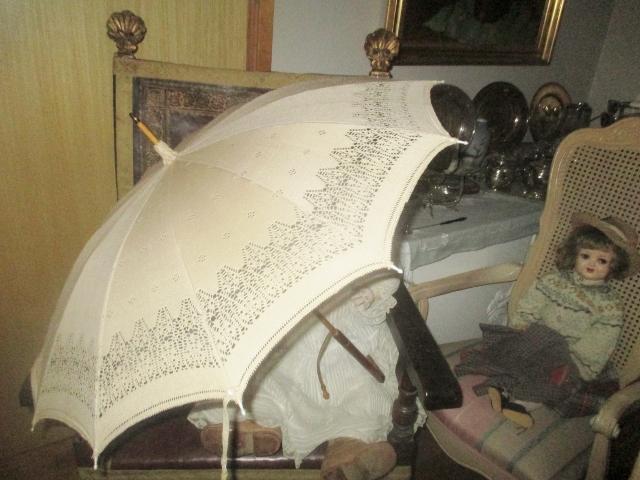Beatiful white Cotton parasol, whit a borer of eyelet. Mechanismen Works excellent The handle is in carved Wood. Over all in excellent condition. The diameter is 73 cm. I do not know the age of the parasol, but it is old. I've seen similar have been reported as victorian. It is here listed as 1920s, but may be from WWI