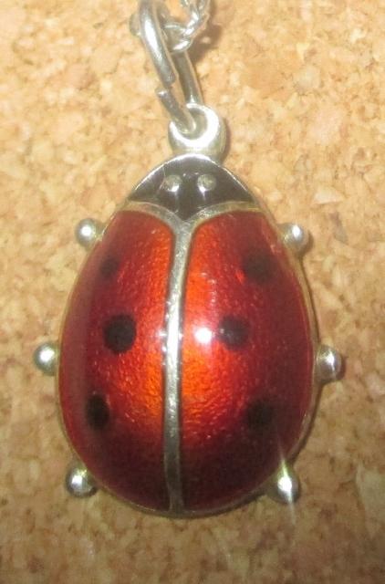Ladybug pendant. According to ancient myths is the ladybug named after the Virgin Mary and was sent from God to protect grain against aphids attack. But "happiness animals" is also very useful helpers in the fight against leaf lice in the garden. The pendant is trademark DA Norway Sterling 925. This stamped used the famous Norwegian firm David Andersen from 1925 and they use it yet. The pendant is in excellent condition.
