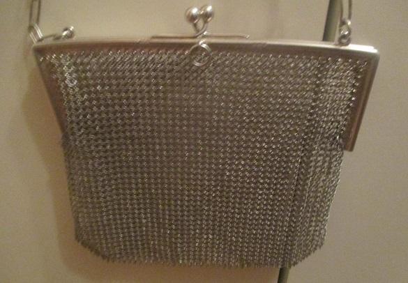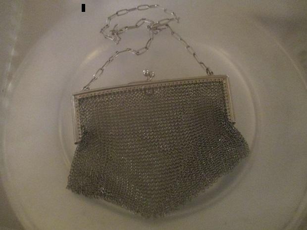 A sterling silver ladies chain mail bag bearing London import hallmarks for 1912. Measurements exclude the handle chain.