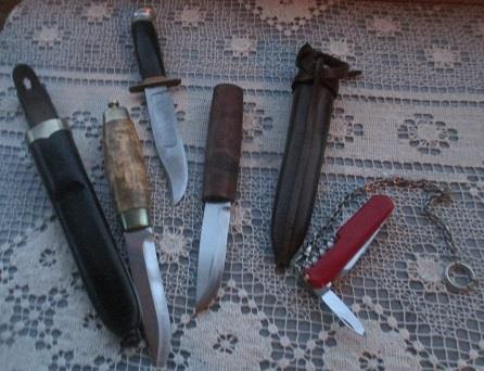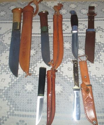 xxM1221M Sports Ba with exciting content. Sports Bag with an eciting content. Hence the three cartridgge belts, the gun cover. Rifle cover is stitched in canvas and leather. There with red fabric is not stamped. The green and gray are stamped Rondane Brede Vollstad. A well known norwegian designer. They are bought in Oslo in 1980-1990, On picture 3 seen four knives, 3 in leather case. From the left knife with horn handles in leather case. It is labeled M. Brusletto Geilo, made in Norway. The firm is known for its quality knives. Knife number two from the left is marked, but indistinch. Knife number three from the left in leather case, brand but indistinch. Knife four pink folding knife. On image four appear five sport knives. Number one from the left in leather case, horn handles and signed. Number two from the left, the knife is in leather case and have wooden handles. Signed with the same signature as number one. (I must have help in deciphering)Number three in leather case i find no signature. Under: number one from the left side knife with horn handles are unable to descipher the signature. Number two from the left. It is marked Puma Germany. Sportsveske med et spennende innhold. Derav tre patronbelter, to geværcover. Geværcoverene er sydd i lærret og skinn. Det med rødt stoff er ikke stemplet. det grønne og grå er stemplet Rondane Brede Vollestad.En kjent designer. De kan stamme fra 1980-90 tallet. På bilde nummer tre, fire sportskniver, tre har læretui. fra venstre kniv med benskaft i læretui. Kniven er merket M. Brusletto Geilo, made in Norway. firmaet er kjent for sine kvalitetskniver. Kniven ved siden av er uten etui, merket men utydelig. Kniv nummer 3 fra venastre i læretui merket, men utydelig. Kniv 4 rosa foldekniv. På bilde fire vises fem sportskniver. Nummer en fra venstre i læretui, benskaft og signert. Nummer to fra venstre, kniven er i læretui og har treskaft. Signert med samme signatursom nummer en. (Jeg må ha hjelp til tydingen). Nummer tre i etui finner ingen signatur. Nummer en fra venstre nede, kniv i etui med benskaft klarer ikke å tyde signatur, Nummer to fra venstre nedre rekke. Den er merket Puma Germany.