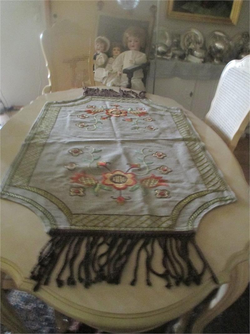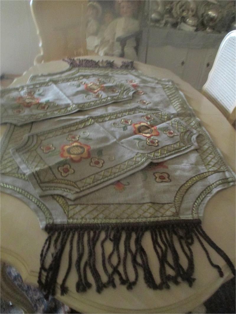 Three beatiful embroidered linen fabrics. The lrhes measures 1,50 meter long plus fringes and it is 0,80 meters wide. The second larges measure 0,70 meters long and it is 0,38 meters wide. The smallest measure: 0,67 meters long and it is 0,38 meters wide.The two smallest are very close to earch others in size. These tablecloth are hand embroidre and in ecellent condition