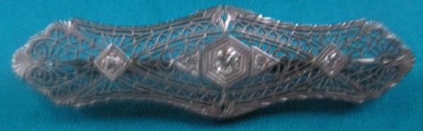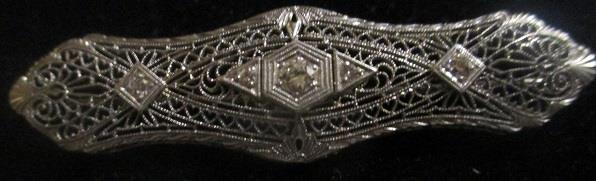 White gold and diamond Art deco filigree brooch. A white gold brooch 4,7 grams. One old-cut diamond weight 0, 13 ct. Two old-cut diamond weight 0,08 ct. Two 8/8 diamond weight 0,04 ct. Takst-Valuation N.Kr 25 000