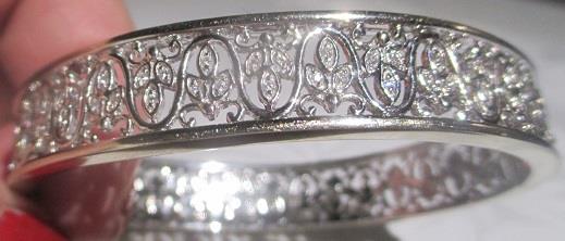 Diamond Bangle Bracelet 14k white gold Filigree. Gorgeous bracelet is a real showtopper. 1/2carat in diamond and 14k plumb white gold. It is 11,5 mm wide with a lovely filigree design. It is Sl l-SI ll and color is approimately G-H weigh 34 grams. Takst-Valuation N. Kr. 37 000