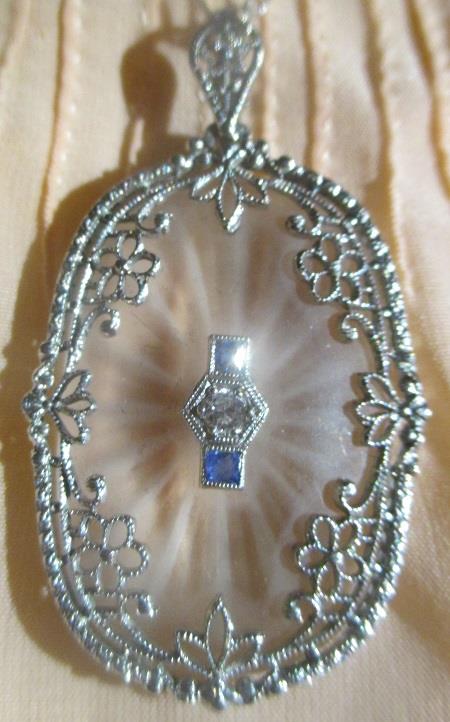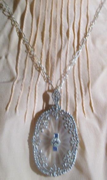A white gold pendant 5,6 grams with rock crystal, 2 sapphires, 1 brilliant calculated weight 0,04 ct with silver chain. Appraisal-Valution N. Kr. 12 000