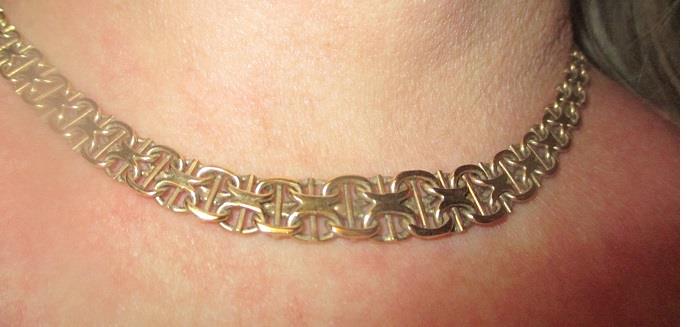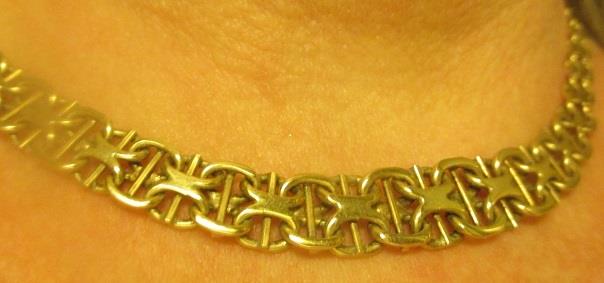 A 14K yellow gold collier X med stav (x with a stick) It is 42 cm long and weight 24,7 grams. In excellent condition. Takst-valuation N. Kr. 20 000