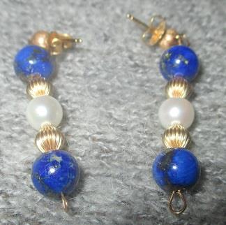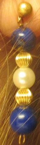 14k Yellow gold two cultured pearl 6,7 mm and four blue lapis lauli dangle earrings approzimately 4,00 cm, 5,3 grams. In excellent condition. Takst-valuation N. Kr. 5000