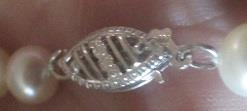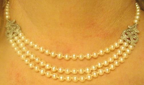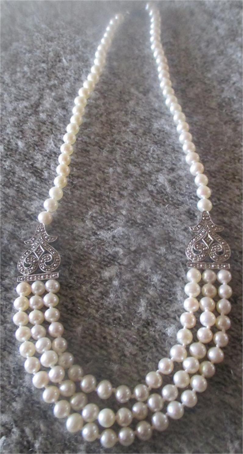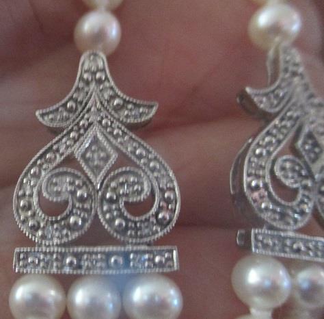 Vintage fresh water pearl necklace with diamond and white gold accents, partly 3 rows 14k white gold claps, 14k white gold accents set with tiny diamonds, 36 8/8 diamonds weight 0,15ct length ca 43 cm. pearls are roughly 4.5-5 mm in diameter. Nice fine fashion necklace in very good condition. Takst-valuation N.Kr. 7000