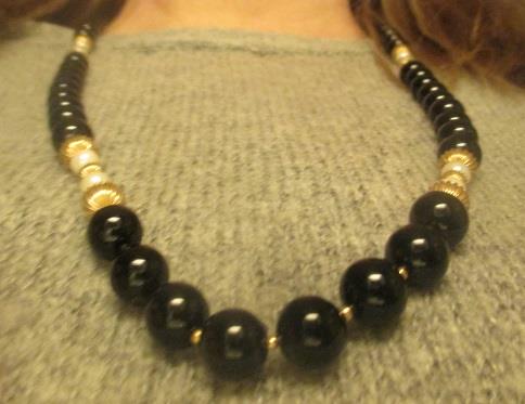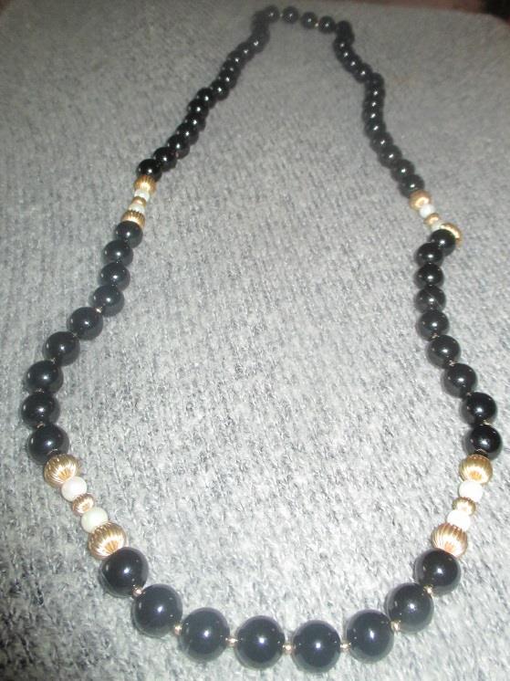 Beautiful necklace, lots of beads (58) between every onyx bead, with 12 big 14k beads and eight cultured pearls. It is 80 cm, weight 86 grams. In very good condition. Takst-Valuation N. Kr. 10000
