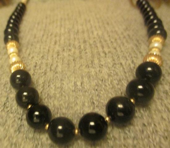 xxM1287M 14k gold pearl and onyx necklaceTakst-valuation N.Kr. 10000