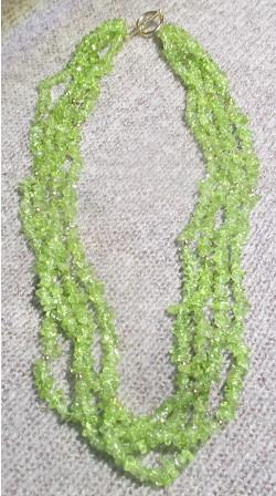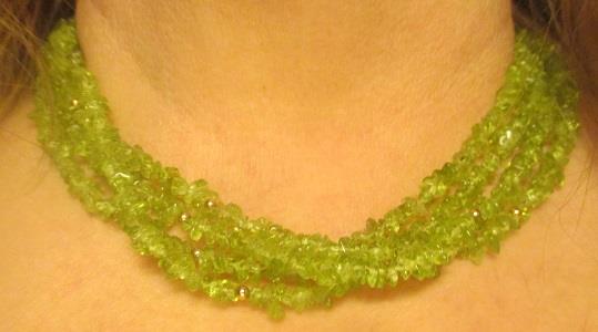 Peridot 4-row necklace with 24 14k gold beads and 14k gold lock. It is 48 cm long and weighs 75 grams. This is one of my favorite jewelry. Takst-valuation N. Kr. 7000