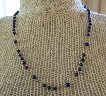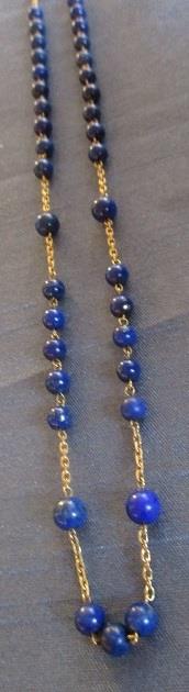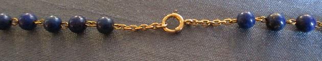 14k gold necklace weigh 15,5 grams with 59 Lapis Lazuli pearls. In ecellent condition. Takst Valuation N. Kr. 15 000