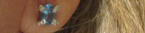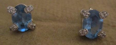 Blue Topaz and Diamond 14k white gold earrings weight 1,8 grams. Featuring oval cut faceted blue Topaz set in 14k white gold prong with 8 small brilliant cut diamonds calkulated weigh 0,04 ct. The errings are 8 x 6 mm with 4 mm rise. Excellent condition