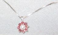 14K white gold pendant and chain 2,9 grams. It has 8 ruby and a brilliant calculated weigh 0,10 ct, Venezian chain 46cm. In ecellent condition.Takst-Valuation N.Kr. 7500